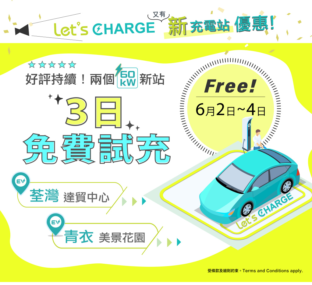 - 優惠期內,客戶可於指定充電站免費使用充電服務一次(閒置費$3/分鐘),包括荃灣達貿中心停車場及青衣美景花園停車場(快速充電60kW*)。*實際充電功率及充電速度會因應不同因素而有所差異,包括電動車的型號、電動車可支援的功率、電動車內的設置、電池設定及充電狀況。