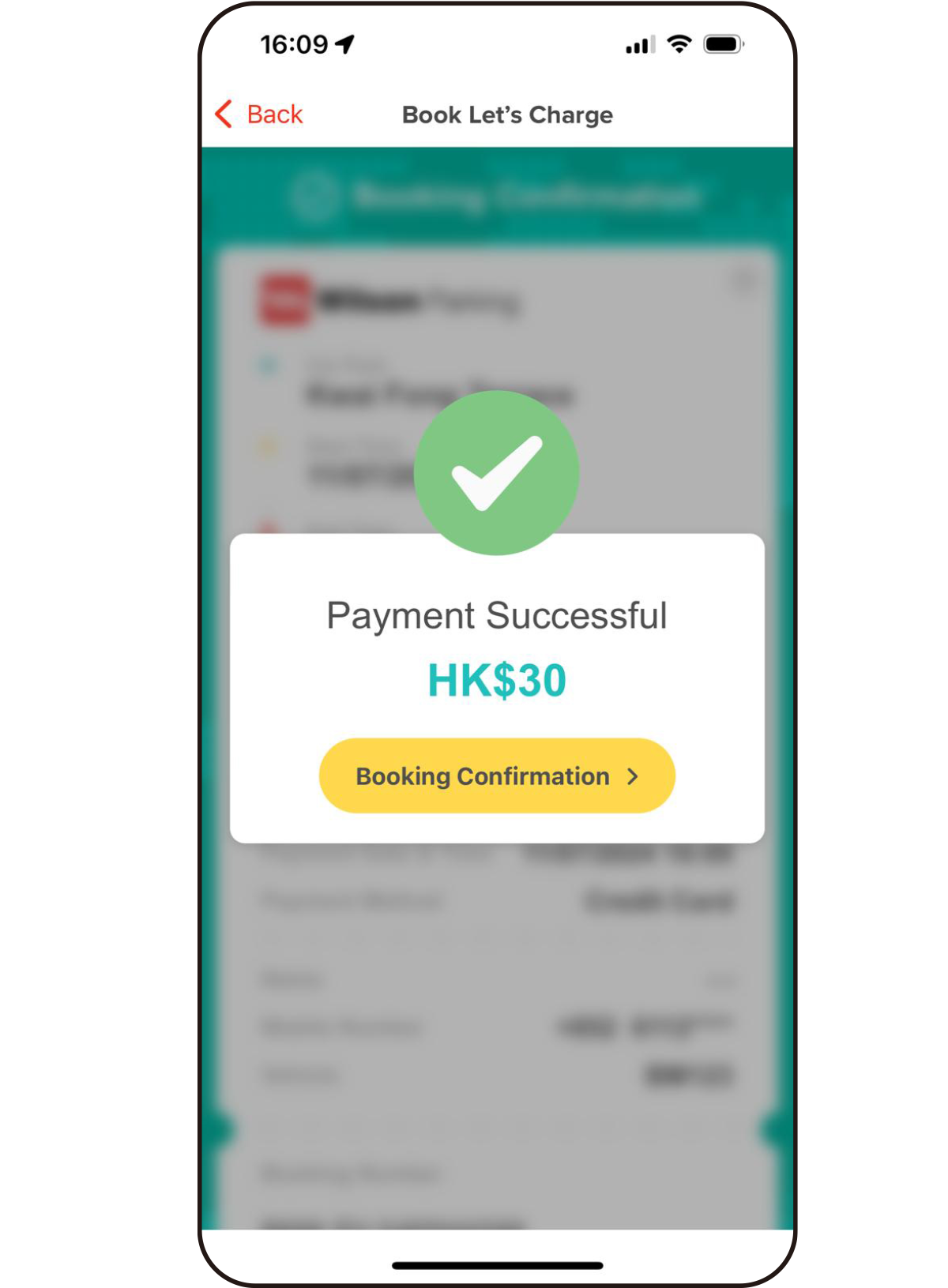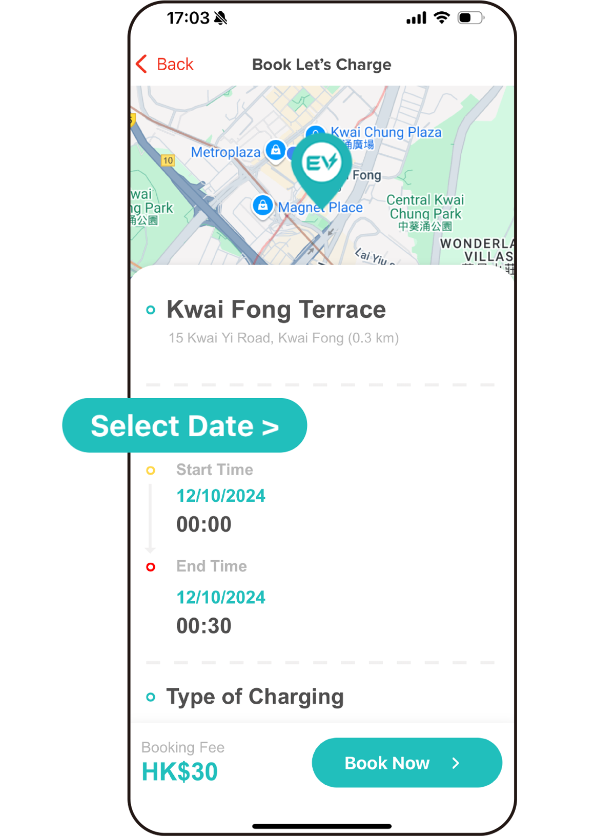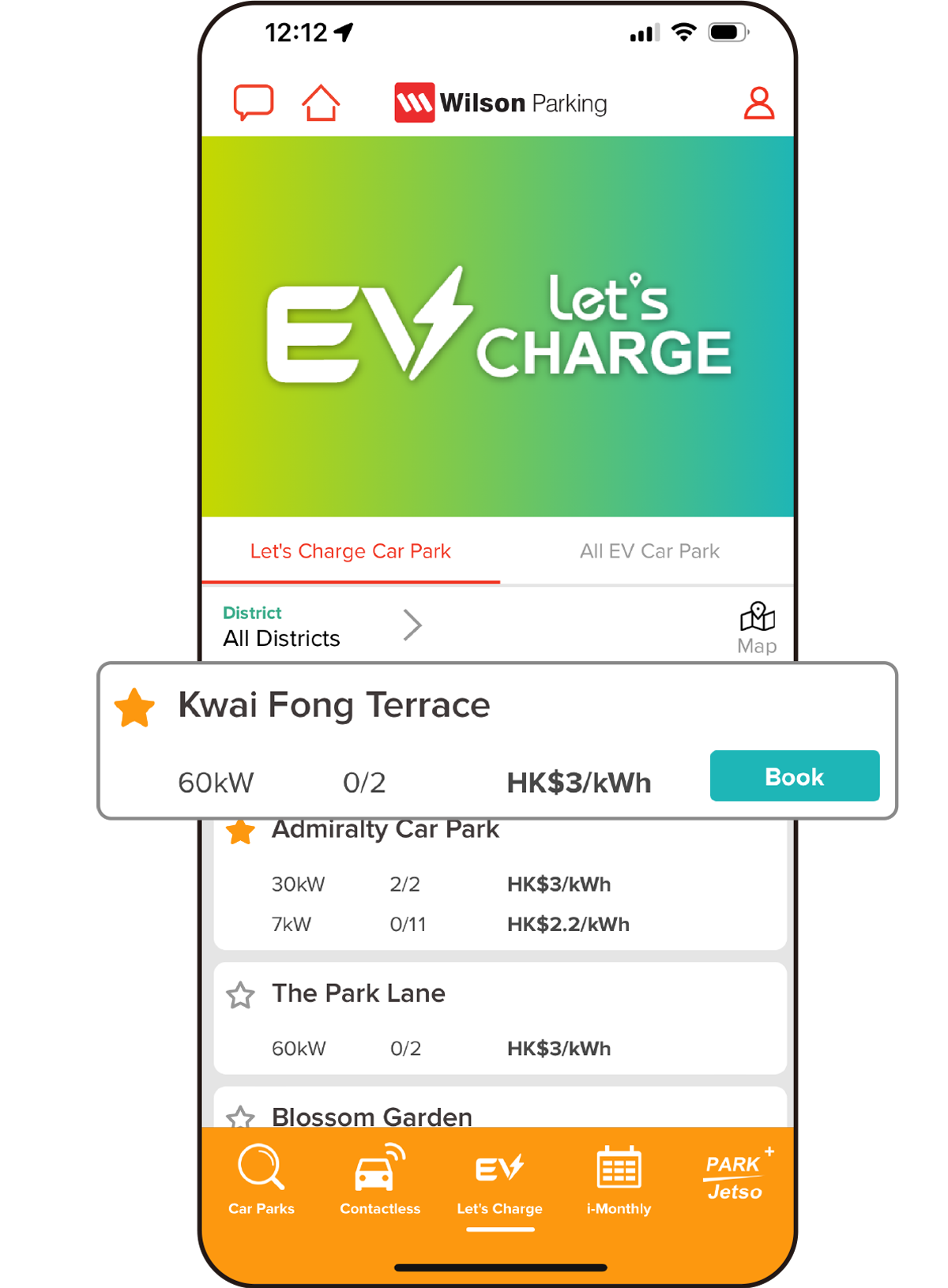 2) Select car park from the EV Let’s Charge Car Park List, tap “Book”.