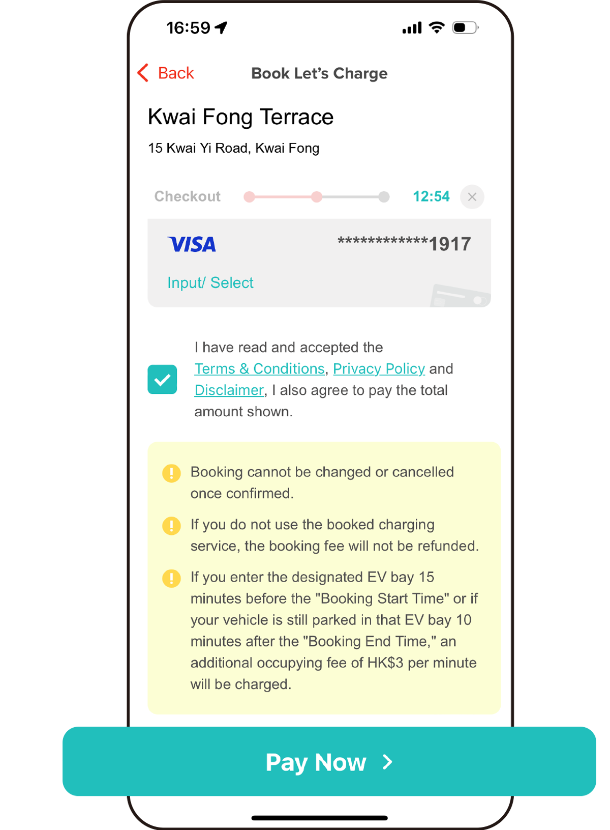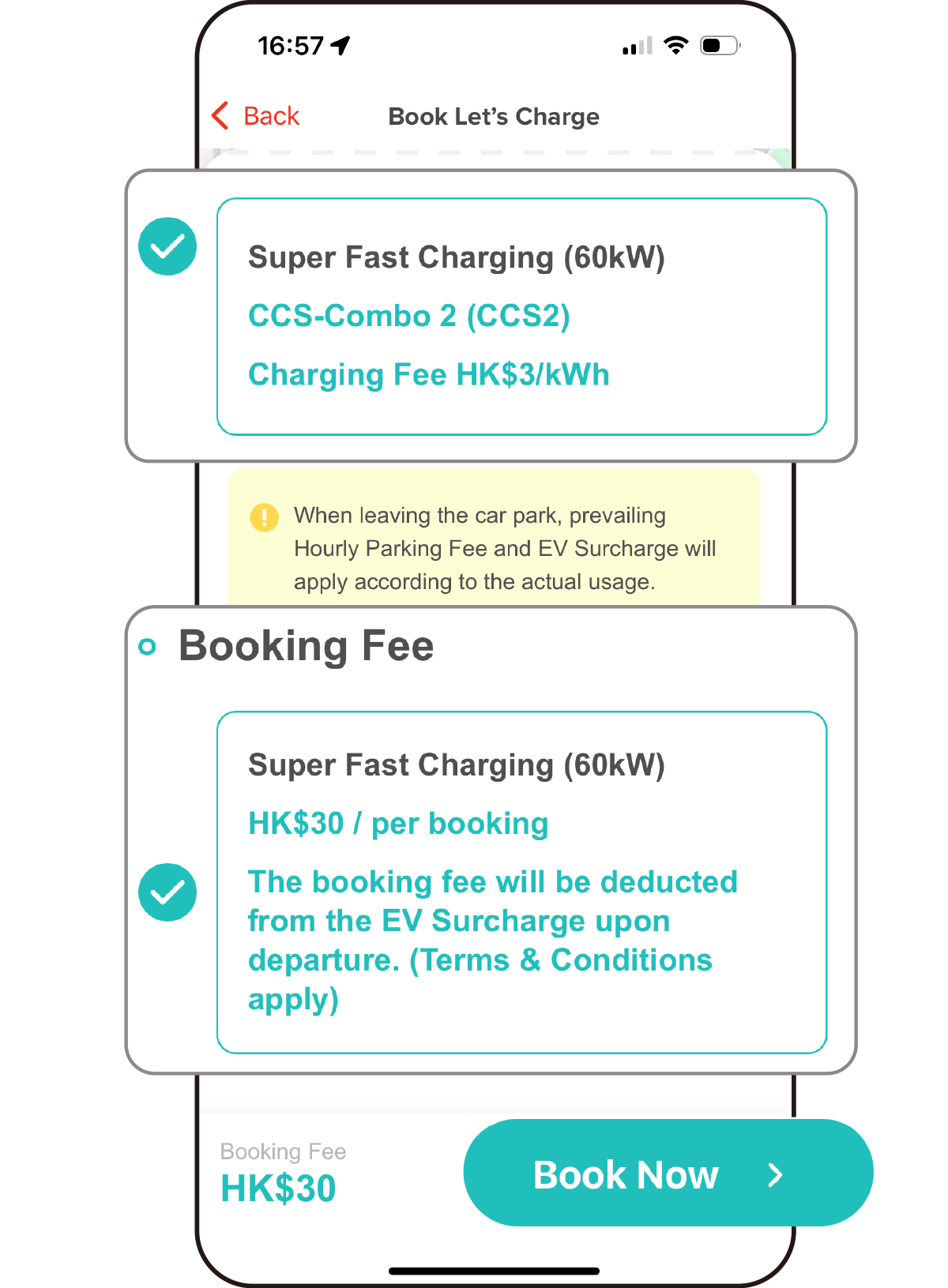 4) Select charging type and booking fee. Tap “Book Now”. Booking fee will be deducted from the EV Surcharge upon departure.